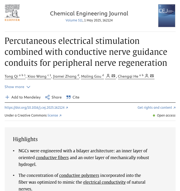 | 四川大学华西医院康复医学中心/康复医学研究所何成奇团队联合生物治疗全国重点实验室苟马玲团队于2025年3月在Chemical Engineering Journal 发表文章“Percutaneous electrical stimulation combined with conductive nerve guidance conduits for peripheral nerve regeneration”(点击二维码阅读原文)。本研究构建一款以导电取向纤维为内壁、水凝胶为力学增强外层的神经导管,用以模拟天然神经导电性,定向高效地传递外源性电刺激和内源性电生理信号。与经皮低频电刺激共同作用,促进周围神经形态和功能的恢复,为神经损伤修复提供了再生康复治疗新策略。 全球每年超过100万患者由于意外灾害、医源性损伤等原因造成周围神经缺损,其预后差、致残率高,给患者、家庭和社会带来极大负担。神经引导导管(nerve guidance conduits, NGCs)是目前最有前景的疗法,但神经再生速度有限导致运动终板和靶肌肉长期失去电信号调控而发生退变、萎缩,影响患者肢体功能的康复效果是亟待解决的关键问题。电刺激是临床上常用的康复理疗技术,在神经损伤及修复术后发挥促进轴突再生、缓解神经痛以及防止肢体肌肉萎缩等作用,但绝缘的NGCs材料限制着其早期及时实施和发挥最大效用。因此导电的NGCs具有更好的仿生特性,以便在体外实施经皮电刺激治疗时响应并传输电信号,且在无额外电刺激时传递体内自发的神经电生理信号,维持运动终板的功能和形态,减缓靶器官失神经支配、肌肉纤维化的速度和程度。 本研究利用静电纺丝技术,以掺杂聚苯乙烯磺酸的聚(3, 4-亚乙二氧基噻吩)[poly(3, 4-ethylenedioxythiophene): polystyrene sulfonic acid, PEDOT: PSS]和壳聚糖(chitosan, CS)为原料制备内部取向导电层,在其外部均匀包裹聚醚F127二丙烯酸酯(pluronic F127 diacrylate, F127DA)水凝胶作为弹性支撑结构,共同组成导电NGCs,并在经皮电刺激的作用下,体内观察其对大鼠坐骨神经10 mm缺损的修复作用,对再生神经的形态和功能进行综合评价。 本研究首先探究了PEDOT: PSS的浓度,以期在最少添加量和最大生物相容性的前提下模拟天然神经导电性。随后验证了F127DA水凝胶对NGCs力学性能的改善。体外实验表明本研究所制备的导电NGCs具有良好的生物相容性,能促进施万细胞突起的定向延伸。将所制备的导电NGCs结合体外低频电刺激用于修复大鼠坐骨神经缺损,结果表明,导电NGCs可显著促进周围神经形态和功能的恢复,达到自体神经移植的修复效果。 坐骨神经支配足部的感觉和运动。因此,可以通过手术侧的足底痛觉阈值来评价感觉功能的恢复情况,通过步态分析和坐骨神经指数(sciatic nerve functional index, SFI)来评价运动功能的恢复情况,通过神经电生理检测并分析复合肌动作电位(compound muscle action potentials, CMAP)和神经传导速度(nerve conduction velocities, NCV)来评价再生神经的电信号传导功能。结果显示,相较于非导电NGCs组(CF),导电NGCs组(CPF)具有更好的肢体功能恢复结果(图1)。 图1 A、B. 各组大鼠术侧热痛阈值和60 s内舔足反应次数;C、D. 各组大鼠的足迹和SFI值;E. 各组大鼠术侧代表性CMAP;F、G. CMAP和NCV的统计结果 术后对再生神经进行染色分析,结果显示,CPF组的神经再生速度与自体神经移植组(AUTO)相似。值得注意的是,与AUTO组不同,CPF组和CF组中GAP43和NCAM1的阳性信号在管壁内侧处明显聚集,且沿着管壁的方向呈取向分布(图2)。由此我们分析,两种NGCs的内壁取向纤维都有利于施万细胞和轴突的黏附和定向延伸,而CPF管壁明显具有更好的黏附效应。GAP43在CPF组分布更多,说明相较于CF组具有更多的生长轴突。这可能是添加了导电高分子的纤维具有更好的促进神经修复能力的机制所在。 图2 A. 术后3周再生神经HE染色;B. 术后12周再生神经HE染色以及NF-200(绿)和S100-β(红)染色;C. 各组中NF 200阳性定量统计结果;D. 术后3周再生神经样本NCAM(绿)和GAP 43(红)染色 周围神经最重要的靶器官是骨骼肌,其结构、功能和营养受周围神经支配和调节。坐骨神经损伤后,缺乏神经营养和神经支配的腓肠肌就会萎缩,失去收缩功能。随着时间的推移,肌纤维萎缩进一步加剧,逐渐被增生的结缔组织和脂肪组织所取代。因此,腓肠肌萎缩程度也是评价坐骨神经修复效果的重要指标。本研究比较了各组大鼠的腓肠肌湿重比和纤维化程度,与上述形态学和功能结果一致(图3)。 图3 A. 健侧(左)和术侧(右)12周后的腓肠肌照片;B. 腓肠肌Masson染色;C. 术后12周的腓肠肌湿重比统计图;D、E. 各组胶原沉积面积和肌纤维面积定量分析结果;F. 各组平均肌纤维直径统计结果 综上所述,本研究设计了导电NGCs用于修复周围神经缺损。定向导电纤维的结构设计可以在经皮电刺激治疗期间响应并传输电信号,并在没有额外电刺激的情况下传输体内自发的神经生理信号,减缓靶器官去神经支配和肌肉纤维化的速度和程度。将导电NGCs与经皮低频电刺激联合用于修复大鼠坐骨神经缺损,能够显著促进周围神经形态和功能的恢复,达到与自体神经移植相似的修复效果。本研究在传统NGCs的基础上,模拟天然神经导电性进行创新设计,为周围神经缺损的临床治疗提供了新的再生康复研究方向。 专家点评 王光林教授:周围神经缺损患者的神经再生速度有限,长期失神经支配会导致靶器官失用,继而限制功能恢复的速度和程度。该研究立足于此,结合神经康复领域常用的低频电刺激疗法和再生医学的组织工程技术,设计了一种新