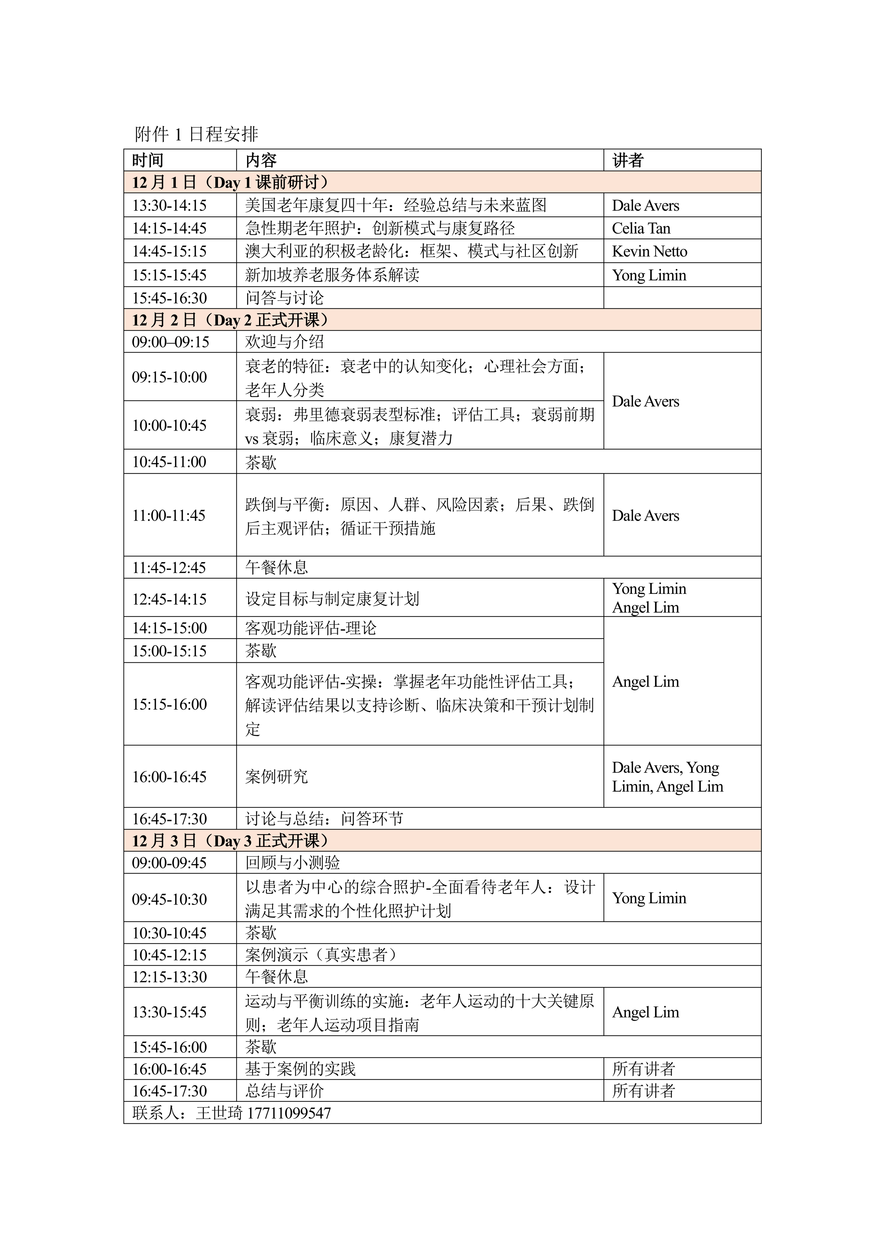 本次研修班致力于提升物理治疗师与康复专业人员在老年衰弱及跌倒领域的专业能力,帮助其掌握基于循证医学的专业知识与临床实践技能。通过系统的理论学习、案例分析及实操训练,参与者将实现以下目标: l 深入理解衰弱与跌倒对老年人生理、认知与社会心理健康的多元影响; l 准确识别导致老年群体跌倒的内在和外在风险因素; l 熟练运用经验证的评估工具(如SPPB、起身行走测试、平衡测试)评估患者功能状态并预测预后; l 基于评估结果,制定个性化、可执行的康复目标; l 设计并实施涵盖肌力、移动能力、平衡及跌倒预防的综合干预策略; l 确定符合患者预后情况及个人功能潜能的SMART目标(具体、可衡量、可实现、相关性强、有时限)。 二、培训时间:2025年12月1-3日