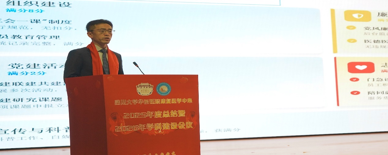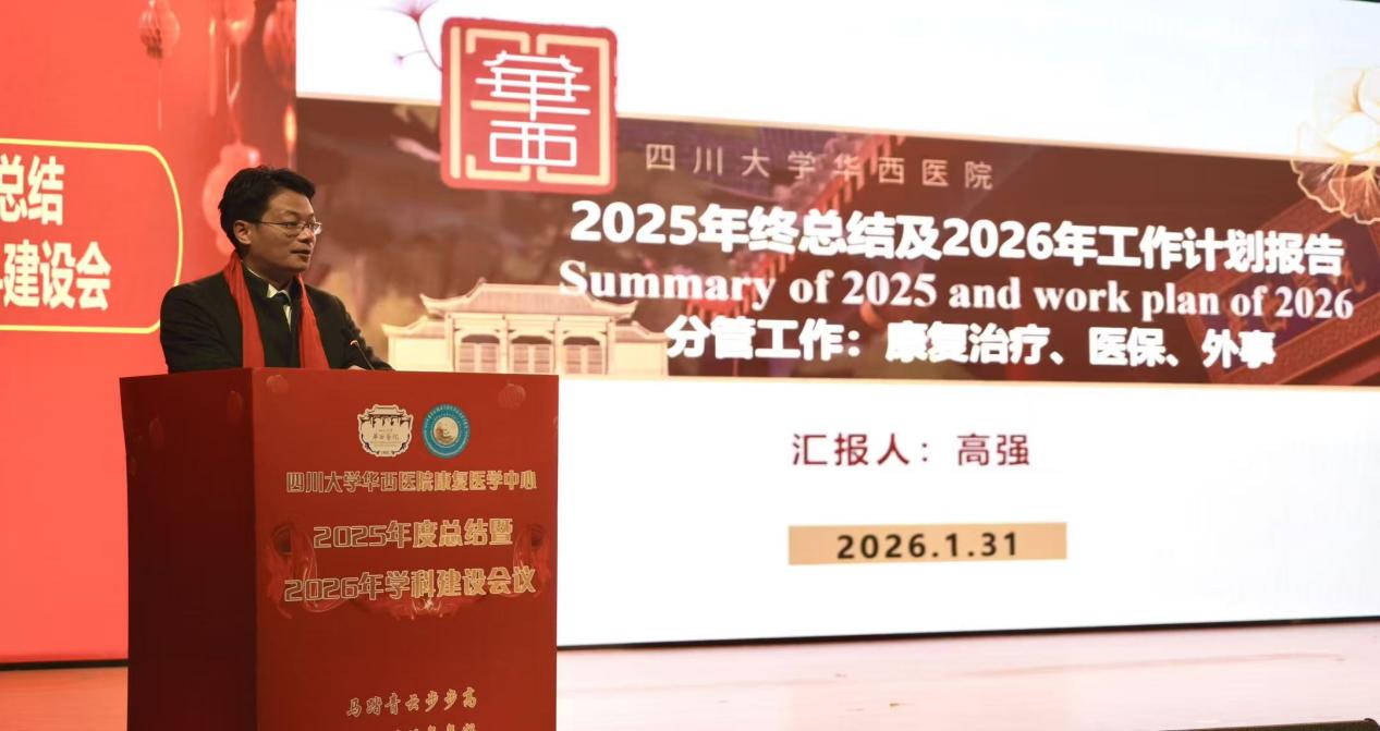 2026年1月31日上午,四川大学华西医院康复医学中心在厚德楼多功能厅召开2025年度工作总结暨2026年学科建设规划会议。中心党总支书记、医疗主任何红晨主持会议。 华西医院党委副书记申文武,温江院区综合办公室主任唐绍军,康复医学中心苏勇林教授、荣誉教授熊恩富出席会议。康复医学中心全体职工及学职人员参会。 申文武副书记在致辞中充分肯定了康复医学中心过去一年在医、教、研、管各方面取得的扎实进展。他表示,中心展现出积极进取、协同共进的良好态势,并勉励全体人员在新的一年里继续凝心聚力,推动学科发展迈向更高水平。 何红晨书记系统回顾了2025年中心在党建引领、业务融合与服务提升等方面取得的成效,并对2026年学科核心能力建设提出明确方向。杨永红副主任就年度教学成果进行总结,并汇报了新一年教学工作计划。高强副主任围绕治疗师队伍与特色技术建设,强调坚持“以患者为中心,以科研为指导,以实践为目标”的康复发展路径。杜春萍护士长总结了年度护理工作,回顾康复护理二十年发展历程,并提出“十五五”期间持续推动护理高质量发展的目标。刘祚燕副护士长就后勤保障、设备管理与文化建设等方面作了汇报。 康复医学中心主任魏全教授围绕科研与学科融合发展作重点发言。他指出,2025年中心在多个领域取得系列成果,学科影响力持续提升,实现了从“盆地”向“高原”和“海洋”的跨越。未来,中心将着力推动康复医学中心、临床研究中心及重点实验室向国家级平台迈进,为实现学科长远发展奠定坚实基础。 学科主任何成奇教授作题为《做强亚专业,推动学科高质量发展》的专题报告。他强调,2026年将加快构建“临床亚专业—基础研究—成果转化”一体化体系,以智慧康复和亚专业深耕作为学科发展的重要支撑。他回顾了华西康复数十年的发展传承,指出必须始终围绕“健康中国2030”战略部署,坚持“重基础、提质量、强转化”的科研方向,与全体同仁共勉前行。 会议对2025年度表现突出的集体与个人进行了表彰。随后举行的迎新春文艺活动,气氛热烈融洽,展现出中心团结奋进、昂扬向上的精神风貌。 最后,全体与会人员在启德堂前合影留念,会议在充满希望的氛围中圆满结束。 微信扫一扫,阅读更方便^_^ |