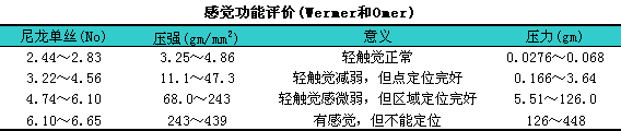 感觉功能的检查方法如下: 1.触觉:①vonFrey试验:Semmes-Weins-tein尼龙单丝,根据不同号的尼龙单丝对皮肤的压力不同,测定皮肤触觉敏感程度。②两点鉴别能力(twopointdiscri-mination,2PD):Weber/Moberg2PD测定法是测定静止两点鉴别觉(s2PD),Weber/Dellon2PD测定法是测定移动两点鉴别觉(m2PD)。③振动觉检查:使用音叉测知。④砂纸试验:使用不同粗糙程度的砂纸,测定手的移动触觉。⑤拾物试验:比较闭眼和睁眼时拾起数件小物品的能力。⑥精确感觉抓握试验(precisionsensorygriptest):闭眼时将螺母从螺丝上旋下能力的测定。⑦五物试验:使用5种小而硬的物件的边缘刺激指尖,测定敏感程度。 2.痛觉:用针尖和针头刺皮肤而测知。 3.Tinel征。 4.温、冷觉。 5.位置觉。 常用感觉功能评价方法如下: 1.Werner和Omer的vonFrey评价法(1980)(见下表)。