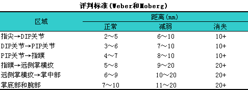 3.Moberg的2PD评价(仅指正中神经、尺神经支配的绝对供应区): S4:良好:<12mm。 尚可:12~15mm。 S+3:不良:15~20mm,粗大把持,防御反射(+)。 S3:差:>20mm,防御反射(+)。 S2:感觉过敏、错感觉、把持障碍。 S1:轻触觉、针刺觉(+)。 S0:感觉丧失。 4.Highet评价标准: S0:绝对供应区内感觉丧失。 S1:绝对供应区内深感觉恢复。 S2:绝对供应区内浅表痛觉和触觉一定程度的恢复。 S3:绝对供应区内浅表痛觉和触觉恢复,“过反应”消失。 S4:在S3的基础上有2PD的恢复。 5.津山判定标准(1970): 优:绝对供应区内浅表痛觉和触觉恢复,无“过反应”,有定位能力,两点鉴别能力存在。 良:绝对供应区内浅表痛觉和触觉恢复,无“过反应”,有定位能力,但无两点鉴别能力,亦不能辨别粗滑。 可:绝对支配区内浅表痛觉和触觉在一定程度上恢复,“过反应”残存。 差:绝对支配区内感觉丧失或仅深痛觉恢复。 6.Sundland感觉功能评价法(1978): (1)针刺感(pinprick): P.0──皮肤感觉消失。 P.1──感觉到皮肤上有物接触,但不能区别是针尖还是针头在触及皮肤,感觉能或不能定位。 P.2──能区分是针尖还是针头触及皮肤,针尖刺皮肤引起:①钝痛感。②不愉快感,有明显的放射和假性牵涉(falsereference)。 P.3──钝刺感或锐刺感,伴放射和假性牵涉,除知道痛在手部或手指、腿部或足外,不能具体定位。 P.4──锐感觉存在,伴或不伴有刺感或刺痛,无或有很轻的放射,能定位到2.0cm内。 P.5──对针刺有正常感觉,定位精确。 (2)轻触觉(lighttouch): L.0──对轻触觉不能意识到。 L.1──意识到皮肤上有物接触。 L.2──轻触引起放射性麻感,对刺激点不能定位。 L.3──轻触觉仅能被察觉到,除知道在手部、掌面、手背或手指,下肢的腿和足外,不能具体定位。 L.4──对轻触能意识到,但敏锐度较弱,能定位到2.0cm内。 L.5──对轻触有正常感觉。 (3)两点辨别觉: D.0──无两点辨别能力。 D.1──2PD部分存在。 D.2──2PD正常。 (4)温度觉: T°0──无温度觉。 T°1──除高温度或剧冷,对普通的温和冷无感觉。 T°2──温度小于15°和大于60°时能分别正确感到冷或暖,在此温度范围内,用测试管或测试盘接触皮肤,有触觉或感到压力。 T°3──温度小于20°或大于35°时能分别正确地感到冷或暖,在此温度范围内,用测试管或测试盘接触皮肤,有触觉或感到压力。 T°4──正常温度觉。
